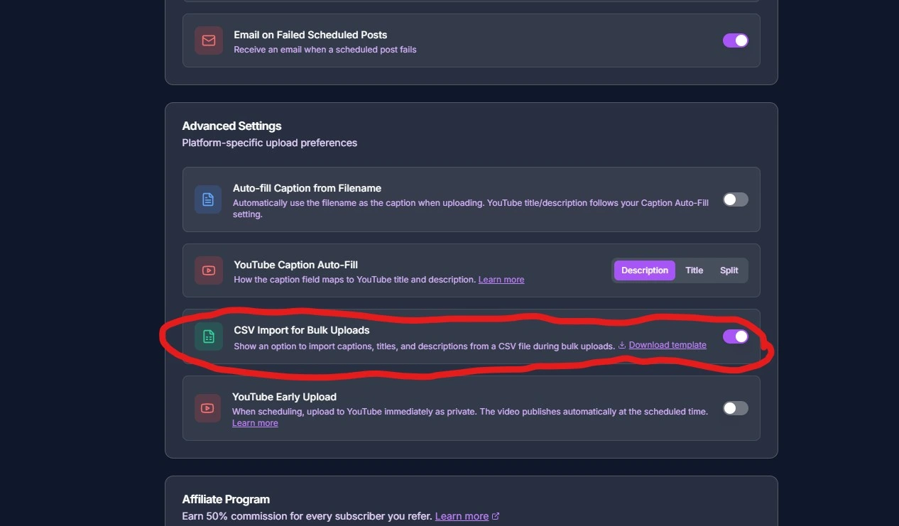 - 1.Enable the feature — Go to Settings and turn on "CSV Import for Bulk Uploads" under Advanced Settings.