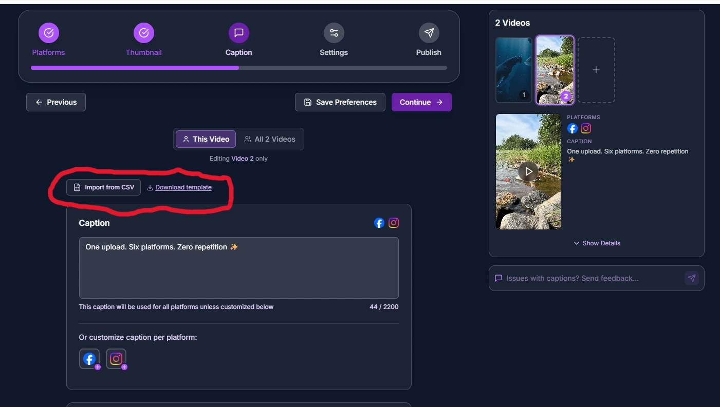 Pre-plan your content in a spreadsheet and auto-fill captions, titles, descriptions, tags, and first comments for each video during bulk uploads.