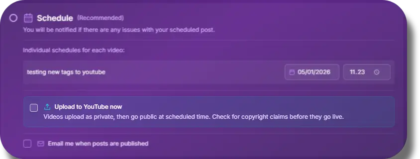 Pre-upload scheduled videos to YouTube for copyright review before they go live.